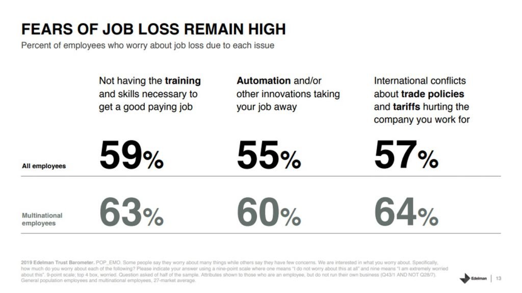 Pessimism and negativity is rife throughout the results with respondents stating a fear of job loss, either because of automation/innovation (55%); not having the training and skills necessary to get a good paying job (59%) or international conflicts which impact their employer (57%).